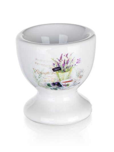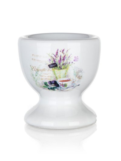 Kalíšok na vajíčko LAVENDER v bielej glazúre s dekórom levandule je vyrobený z keramiky.