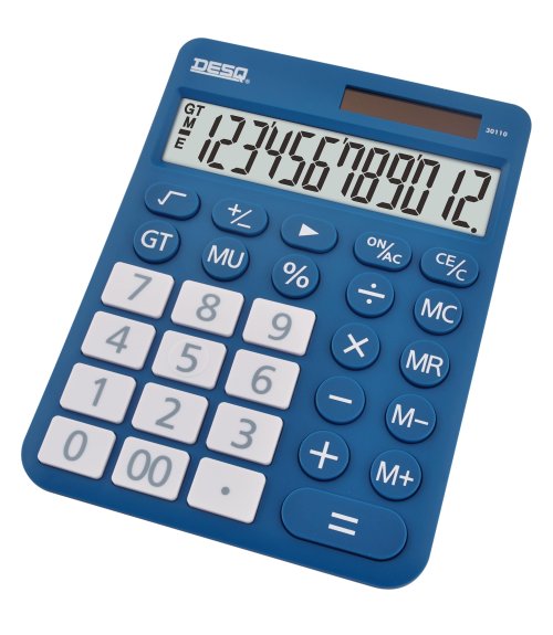 Veľká stolná kalkulačka v tmavo modrej farbe 12 miestny LCD displej Veľké tlačidlá Funkcia MU, GT, Backspace, tlačidlo s dvojitou nulou, tlačidlo (+/-) Tlačidlá pre výpočet percent a odmocniny Trojciferná interpunkcia 4 tlačidlová pamäť Automatické vypnutie, ktoré šetrí energiu Napájanie pomocou solárneho balenia 200 g Rozmer 185 x 140 x 30,5 mm