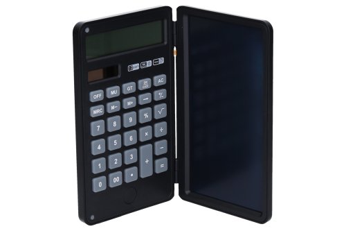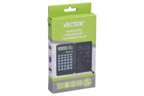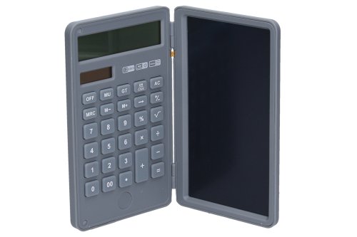 Kalkulačka + elektronický poznámkový blok. Veľkosť kalkulačky v otvorenom stave: 18 x 15 cm. Duálne napájanie - solar + 1x CR2025 batéria. 2 farebné varianty: čierna, šedá.