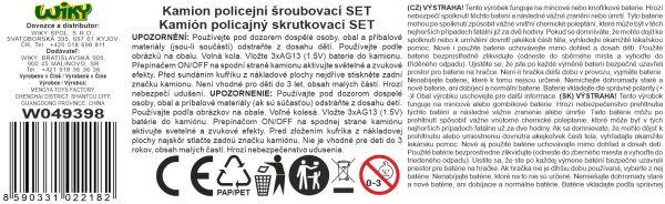 Kamión policajný s 3 autami skrutkovací s efektmi. Rozmery 42x20x9 cm. Svetelné a zvukové efekty. 3xAG13 batérie súčasťou. Voľné kolesá. Obsahuje kamión, kufrík, 3 autá, skrutkovač, 5 značiek. ON/OFF prepínač na spodnej strane kamiónu.
