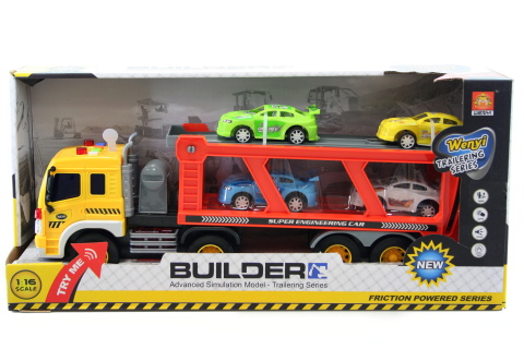 Kamión na batérie (sú súčasťou balenia). Po stlačení tlačidiel kamión vydáva zvuky a svieti. Mierka 1:16. Obsahuje aj 4 plastové autíčka. Rozmery kamiónu cca 40 x 12 cm. Vek 3+