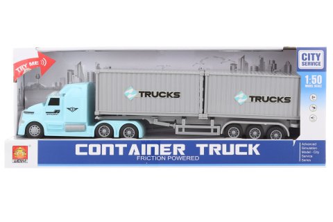Kamión s kontajnermi na batérie. Po stlačení tlačidiel kamión vydáva zvuky a svieti. Rozmery kamiónu cca 36 x 9 x 6 cm. Rozmery balenia cca 39 x 15 x 7,5 cm. Napájanie na 3 AG13 (sú súčasťou balenia). Vek 3+