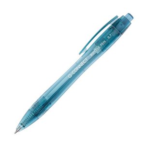 Stláčacie guličkové pero Q-Connect v modrej farbe Vyrobené zo 100% recyklovaných PET fliaš Farba náplne: modrá Šírka stopy: 0,7 mm Množstvo v originálnom balení: 10 ks