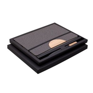 Poznámkový blok, zápisník v textilných doskách, ktoré je možné použiť ako stojan na mobil.