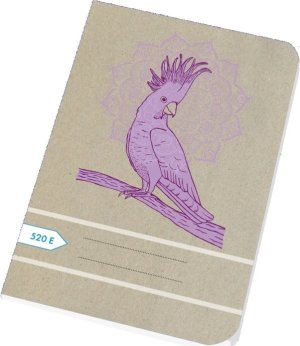 Zápisník s pevnou, v chrbte šitou väzbou v kartónových doskách, obopnutý pružnou páskou proti samovoľnému otváraniu.