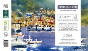 Skicak rady Aquarelle vo veľkosti A4 (209,5 x 295 mm) má dosky z tvrdého kartónu a krémový papier s gramážou 220 g/m2, 20 listov.