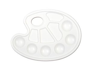 Biela maliarska paleta s 6-mi miskami na farby a 4 miskami na miešanie farieb.