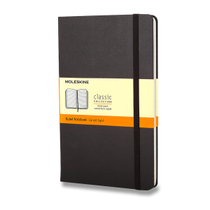 Veľký čierny linajkový zápisník.