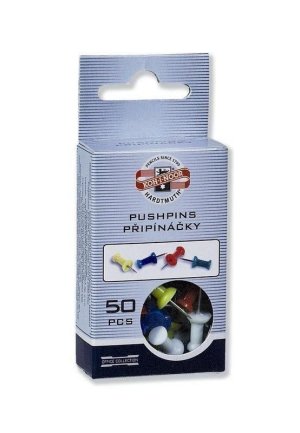 Napináčik s umelohmotným držadlom, výška 23 mm, priemer v najširšom mieste 10 mm, umelohmotný držiak - mix farieb, kovový hrot, 50 ks v papierovej krabičke.