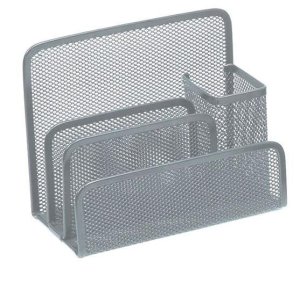 Kovový organizér na listy a písacie potreby v striebornej farbe.