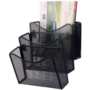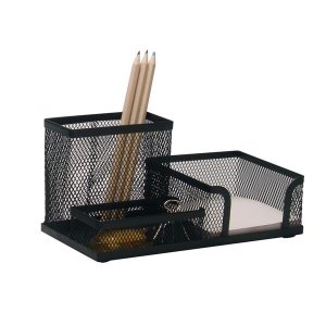 Kovový organizér na listy a písacie potreby v čiernej farbe.