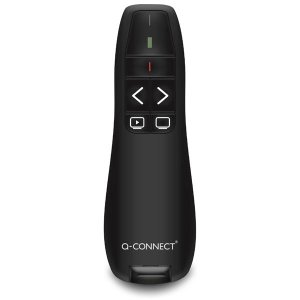 Bezdrôtový ovládač značky Q-Connect s laserovým ukazovátkom a USB prijímačom Ukazovátko je vybavené 5 tlačidlami s týmito funkciami: laser, stránka hore/dole, štart/pozastavenie prezentácie, celá obrazovka, …