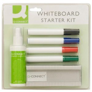 Štartovacia sada 6 kusov pre tabule Obsahuje: 1x čistiacu kvapalinu na biele tabule 250 ml, 1x zlupovaciu gumu na biele tabule a 4 rôzne fixky (čierna, modrá, červená, zelená)
