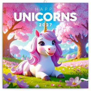 Poznámkový kalendár v pastelových farbách s motívom veselých jednorožcov, ktorí si užívajú život naplno.