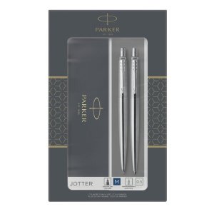 Súprava Duo Set obsahuje guľôčkové pero Parker Jotter Stainless Steel a mechanickú ceruzku Parker Stainless Steel.