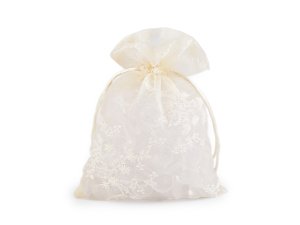 Darčekové vrecúško z organzy zdobí strojová kvetinová výšivka.