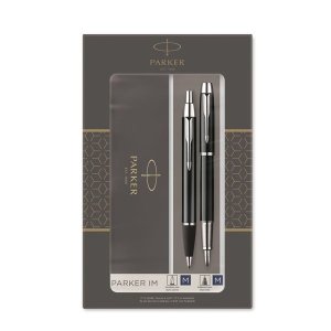 Darčeková sada Parker IM plniace pero + guľôčkové pero Rad Parker IM prináša guľôčkové a plniace pero s elegantným kovovým telom a jednoduchým dizajnom Guľôčkové pero má lesklý čierny lak a chrómové doplnky.
