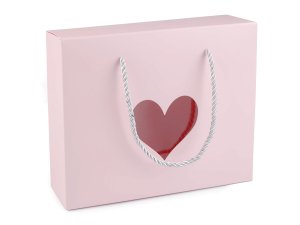 Papierová krabica s priehľadom srdca má uchá z lesklej krútenej šnúry.
