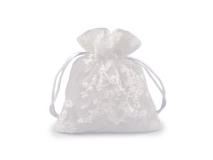 Darčekové vrecúško z organzy zdobí strojová výšivka kvetov.