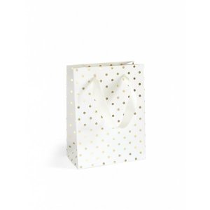 Papierová dekoratívna darčeková taška, rýchly pomocník pri balení vašich darčekov Rozmery: veľkosť S - 20 x 8 x 15 cm Farba: biela Motív: zlaté metalické bodky Počet ks v balení: 5 ks