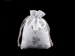 Vrecko s vianočným motívom sa sťahuje pomocou saténových šnúrok.