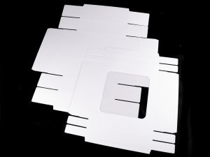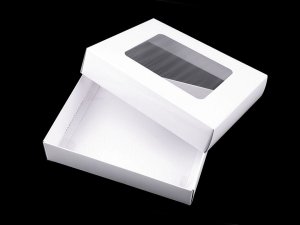Papierová krabica s obdĺžnikovým výrezom vo veku z priehľadnej fólie.