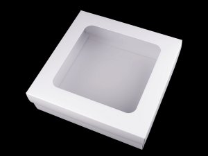 Papierová krabica má ozdobný výrez vo veku z priehľadnej fólie.