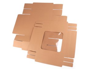 Väčšia papierová krabica má výrez vo veku z priehľadnej fólie.