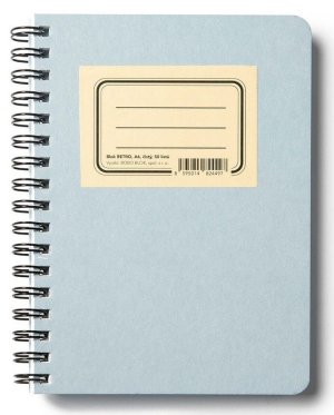 Zápisník s mäkkou, v hornom chrbte šitou väzbou v kartónových doskách, obopnutý pružnou páskou proti samovoľnému otváraniu.