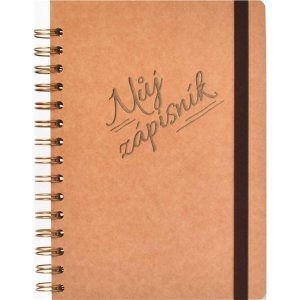 Zápisník s pevnou, v chrbte šitou väzbou v kartónových doskách, obopnutý pružnou páskou proti samovoľnému otváraniu.