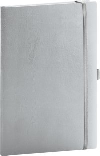 Zápisník s pevnou, v chrbte šitou väzbou v kartónových doskách, obopnutý pružnou páskou proti samovoľnému otváraniu.