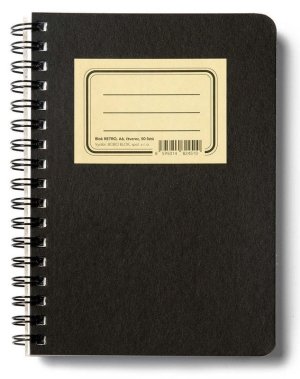 Zápisník s mäkkou, v hornom chrbte šitou väzbou v kartónových doskách, obopnutý pružnou páskou proti samovoľnému otváraniu.