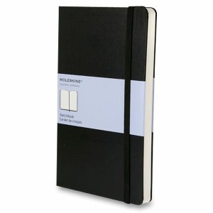 Zápisník vhodný na kresby, skice aj maľby, s pevnou, v chrbte šitou väzbou v kartónových doskách, obopnutý pružnou páskou proti samovoľnému otváraniu.