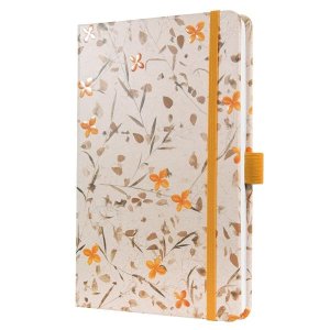 Linkovaný notes v pevných doskách s uzatváraním na gumičku, vreckom na drobnosti a pútkom na ceruzku. 172 strán na žltom papieri.
