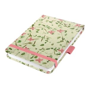 Zápisník s pevnou, v chrbte šitou väzbou v kartónových doskách, obopnutý pružnou páskou proti samovoľnému otváraniu.