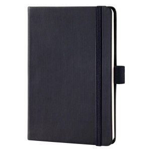Zápisník s pevnou, v chrbte šitou väzbou v kartónových doskách, obopnutý pružnou páskou proti samovoľnému otváraniu.