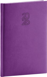Týždenný diár Aprint 2026 vo fialovej farbe.