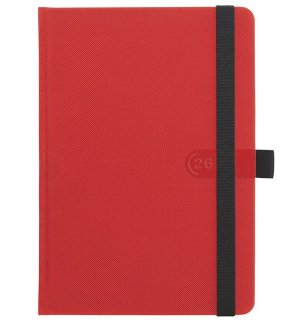 Praktický týždenný diár vo výraznom červenom prevedení s kontrastnou čiernou gumičkou a pútkom na pero.
