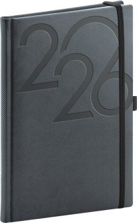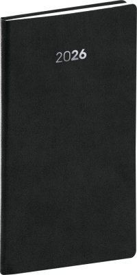 Plánovací vreckový diár Balakon 2026 v čiernom prevedení, doplnený o strieborný letopočet.
