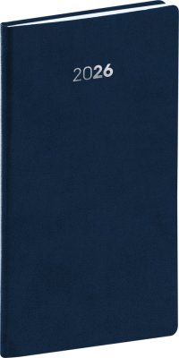 Plánovací vreckový diár Balakon 2026 v tmavo modrom prevedení, doplnený o strieborný letopočet.