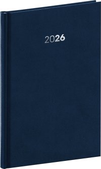Plánovací týždenný diár Balakon 2026 v tmavo modrom prevedení, doplnený o strieborný letopočet.
