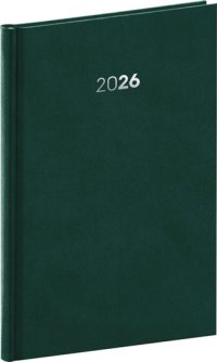 Plánovací týždenný diár Balakon 2026 v zelenom prevedení, doplnený o strieborný letopočet.
