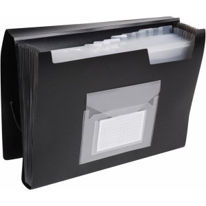 Aktovka s priehradkami na dokumenty do formátu A4, vyrobená z odolného polypropylénu, s jedným vreckom pod predným poklopom na uloženie 2 CD/DVD Uzatváranie na gumičku vo farbe dosiek, umiestnenú v rohoch 13 priehľadných …