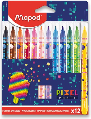 Súprava 12 farebných fixiek Maped Pixel Party vo veselých farebných kombináciách s atraktívnym dizajnom inšpirovaným hernými kódmi.