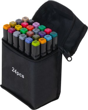 Súprava 24 fixiek v rôznych farbách a plastový stojan pre jednoduché uloženie.