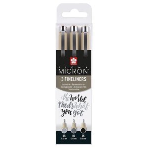 Výber 3 ks fixiek Pigma Micron 05 vo farbách čierna, studená šedá a svetlá studená šedá (šírka linky: 0,45 mm).