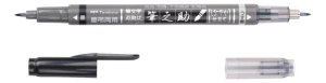 Obojstranná fixka Fudenosuke (brush pen) s dvoma elastickými štetcovými hrotmi (typu soft): čiernym na kreslenie obrysov a šedým na tieňovanie.Linka sa mení od tenkej po hrubú v závislosti na tlaku vyvíjanom …