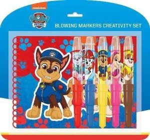 Set obsahuje 5 farebných fúkacích fixiek s potlačou, zošit s obrázkami na vyfarbenie a plastovú šablónku.