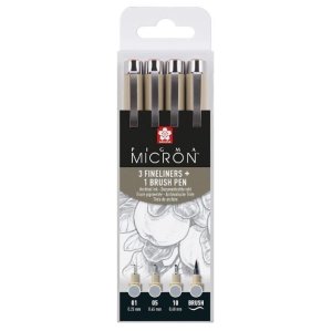 Výber 4 svetlo šedých Pigma Micron a štetcových pier: Pigma Micron 01 (0,25 mm), Pigma Micron 05 (0,45 mm), Pigma Micron 10 (0,60 mm) a Pigma Brush.
