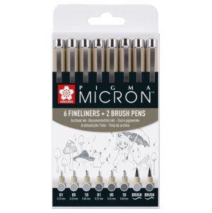Výber 4 svetlo studených šedých a 4 studených šedých Pigma Micron a štetcových pier: Pigma Micron 01 (0,25 mm), Pigma Micron 05 (0,45 mm), Pigma Micron 10 (0,60 mm) a Pigma Brush.